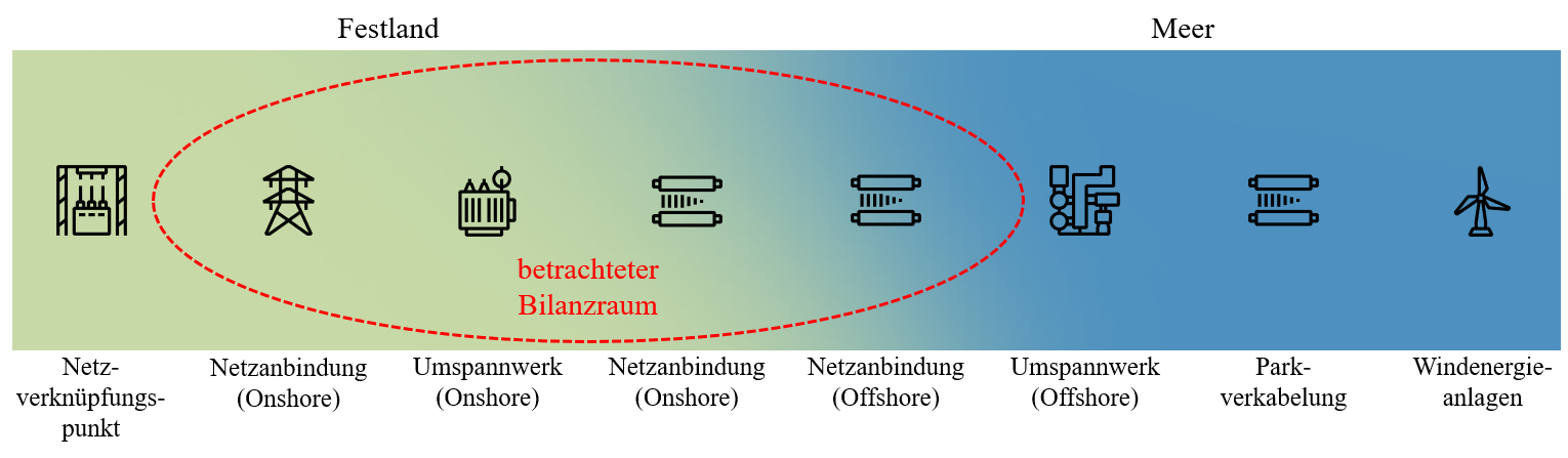 Die technische Betrachtung beschränkt sich auf die luftisolierten Systeme des eigentlichen Einspeiseumspannwerks und die Verbindungskomponenten des Netzanschlusssystems. Hierbei sind die Kompensationseinrichtungen und die Positionierung des Umspannwerkes entlang der landseitigen Verbindungsstrecke zu beachten.